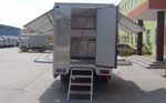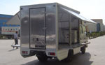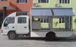 餐车 该车具有蒸、煮、炒、煎等炊事功能,主食为米饭,馒头等。车内提供主、副食加工设备,具备洗菜、切菜。配备发电机组、水箱、水池、车载冰箱、炉灶、照明灯、警灯警报、鼓风机、排油烟机、开水炉等设备。可使用柴油、电源及气源供热。1h内可以完成50-200人饭菜. 用途:用于部队、武警、公安、勘探、石油、电力、通讯和抢险等野外作业单位炊事后勤保障。