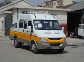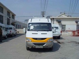 本车型主要采用依维柯系列底盘改装。底盘前后均匀非独立悬挂,非断开式转向式前桥,锻制整体工艺梁,使转向更加灵活、平稳。非断开式驱动后桥,整体冲压焊接桥壳、全浮式半轴使稳定性、平稳性大大提高。真空助力双回路液压制动、冷暖空调使驾驶更安全、舒适。整车配备有车顶行李架等设备。