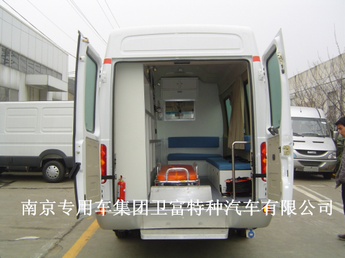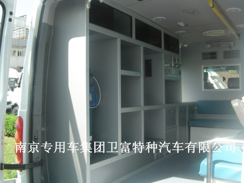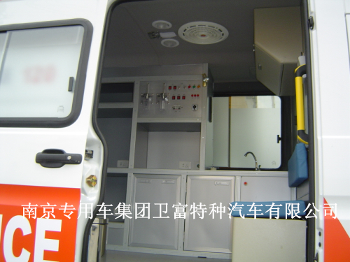救护车配置:蓝色救护车专用灯、托台、红十字、救护标示、外观、中隔断(玻璃推拉窗)、对讲机、消毒灯、多功能电源插座、LED灯、射灯、医疗柜、自动上车担架、担架固定装置、地板、垃圾桶、座椅、安全带、氧气装置、一体式医疗器械柜、逆变电源、外接电源、漏电保护器、换气扇、顶置扶手、输液架、洗手池、担架舱、上车后踏板、挡板、灭火器!