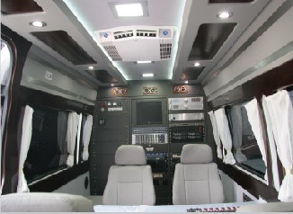 车内设置仪器柜、工作台:配置卫星通信系统、音像传输系统、监视联络指挥系统、供电系统等:车顶安装工作平台及防护围栏;卫星通信天线、升降照明设备、监视器、升降杆;车辆为特殊行业配套时车顶选装相应标志灯具;顶置空调、喇叭、场地照明灯、爆闪灯;小发电机组舱门或工具舱门