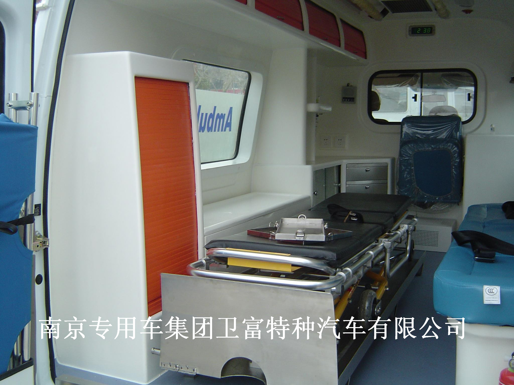 基本配置 1、 长排救护警灯及四周爆闪灯; 2、 后舱一体式高分子内饰; 3、 简易担架及简易担架舱; 4、 设备架及吊柜; 5、 氧气瓶柜,固定安装10L氧气瓶2只; 6、 输液吊钩2只; 7、 消毒灯1只; 8、 污物桶1只; 9、 长条贮藏柜带软座垫、软靠背和安全带1套; 10、 医生陪护座椅; 11、 中隔断带滑窗1套; 12、 照明灯4只; 13、 1000W逆变器、UPS及电池组; 14、 外接市电系统及30米电缆盘; 15、 220V电源插座2组; 16、 中门上车扶手,车顶扶手; 17、 后门上车踏板; 18、 医用耐磨塑胶地板; 19、 后舱空调和暖风(原车规格); 20、 车体外观贴救护标识(见图片); 21、 自动上车担架及担架舱。 选装配置(价格另计) 1. 电动洗手池; 1. 油漆喷制装饰彩条; 2. 玻璃窗贴膜; 3. 可视倒车雷达系统及导航仪; 4. 电动吸引器、监护仪、呼吸机及心电图机等急救设备; |