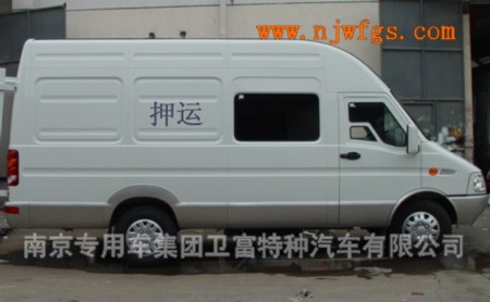车内设置一个带开门隔断,将整个车体分为驾驶、押运舱和运钞舱两大部分。车厢内除设置押运员座椅外,还装备了专用电动升降交费窗口、观察窗、射击孔、保险柜及内外监控系统、通讯系统、专用机械锁具、密码锁、逃生换气装置等。整车防弹防撬、油箱水箱等关键部位防弹防护,运钞舱所有窗户封闭。加装专用警灯警报器及金属防撞前后保险杠。整车达到公安部A级防弹标准。