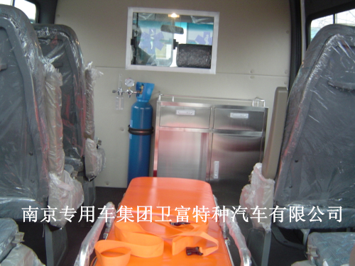 国际流行救护车外型、长条警灯、氧气装置、湿化器、医疗吊柜、车内照明灯、LG蓝色地板革、输液挂钩、医用座椅、陪护座椅(可选装长条座椅及可躺座椅)、上车自动担架、上车挡板、密封中隔断(带玻璃窗)、副驾驶双人座、加宽后上车踏板、白色磨砂磨、另可根据客户要求调整改装。
