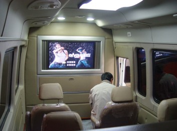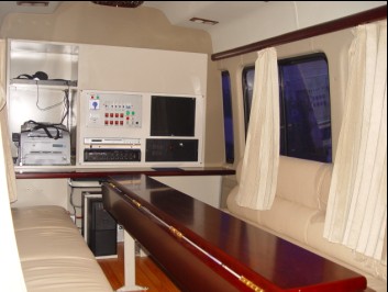 该车主要配制:GPS导航仪、大功率喇叭系统、调音台、硬盘录像系统、长条拐角座椅、豪华旋转座椅、一体化内装饰、大屏幕液晶电视、高保音音响、UPS系统、发电机组、外接电源系统、升降灯、探照灯、广场灯、顶置空调系统、电动中门、胡桃木装饰等。