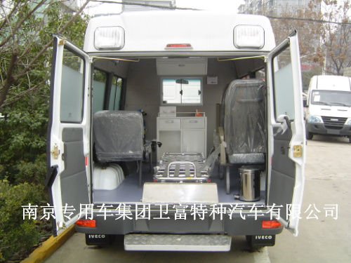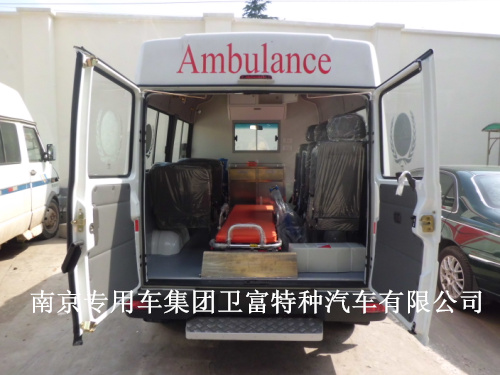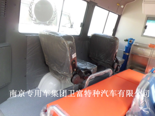 国际流行救护车外型、长条警灯、氧气装置、湿化器、医疗吊柜、车内照明灯、LG蓝色地板革、输液挂钩、医用座椅、陪护座椅(可选装长条座椅及可躺座椅)、上车自动担架、上车挡板、密封中隔断(带玻璃窗)、副驾驶双人座、加宽后上车踏板、白色磨砂磨、另可根据客户要求调整改装。