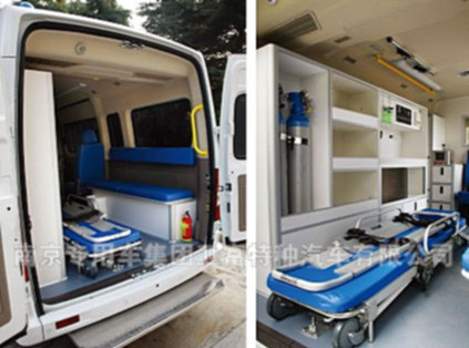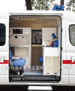 医疗彩条及医疗标识 贴膜 一体式车顶外部造型 车顶四周LED爆闪警示灯 一体化医疗舱内饰 长条家属座椅 铝合金推床式担架 外接市电及绕线盘 双氧气瓶供氧系统 呼吸机 除颤起搏监护仪 脉搏血氧饱和度仪 心脏按压泵 心肺复苏急救盒 骨折固定器 注射泵 洗手池系统 臭氧发生器 辅助蓄电池